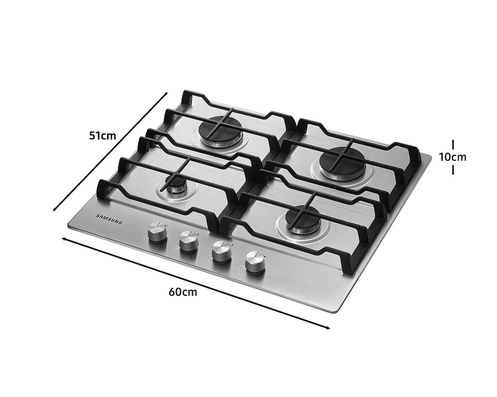 Cocina a gas empotrable Samsung NA64D3010AS/ZS, diseñada para ofrecer potencia, estilo y eficiencia en tu cocina. Cuenta con 4 quemadores de alta calidad, incluyendo un poderoso quemador triple llama que permite cocinar más rápido y de forma uniforme. Su superficie de acero inoxidable brinda durabilidad y un acabado elegante, mientras que las parrillas de hierro fundido aseguran estabilidad para todo tipo de ollas y sartenes. Su encendido eléctrico integrado facilita el uso diario, ofreciendo mayor comodidad y seguridad.