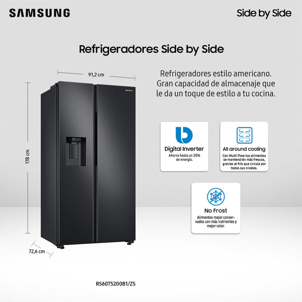 El Samsung RS60T5200B1-ZS es un refrigerador Side by Side con una capacidad neta de 602 litros, diseñado para maximizar el espacio de almacenamiento sin aumentar las dimensiones externas, gracias a la tecnología SpaceMax. A continuación, se detallan sus principales características y especificaciones técnicas: